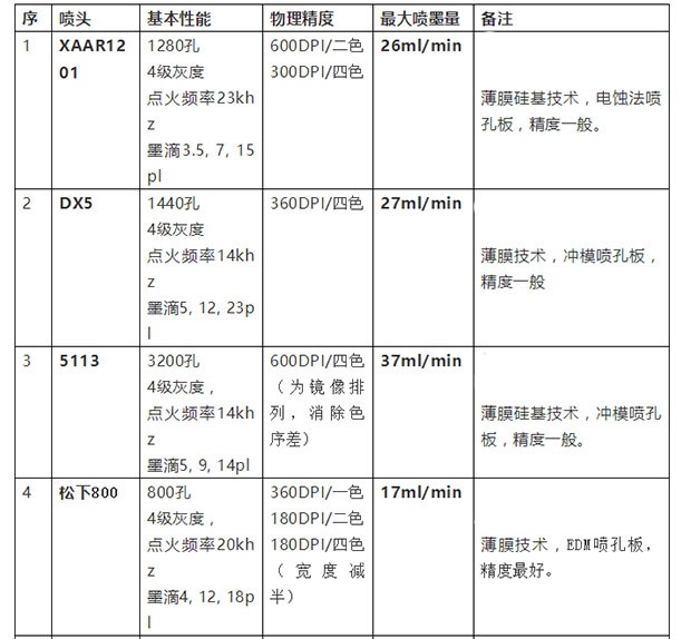 常用噴頭用墨量(每平方用墨量約為15 ml),幾種常用噴頭的基本特性見圖所示。